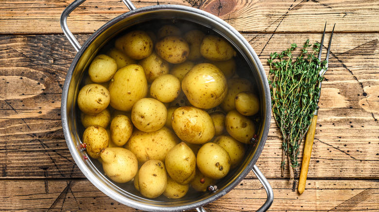 If you've ever boiled potatoes just to see them collapse on the outside before being cooked in the middle, you'll find this tip particularly helpful. According to Gordon Ramsay, in fact, it's best to always start boiling your potatoes from cold water, rather than tossing them into a pot of already boiling water. As he says on his YouTube channel, "This way, by the time the centers of the potatoes are cooked, the outside won't be falling apart."