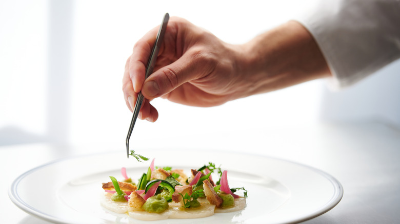 Megan Potthoff is a big fan of plating with tweezers. "I'm definitely a tweezer plater. It helps also with really fine details." Tweezers are great for arranging delicate garnishes precisely.