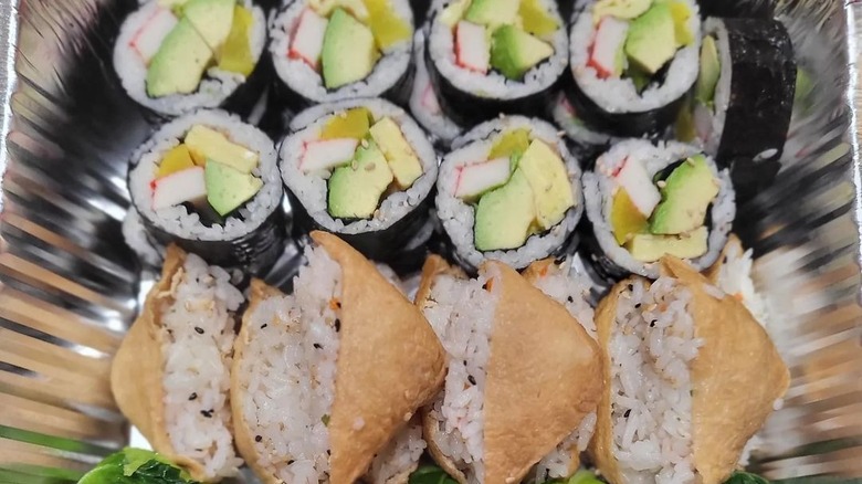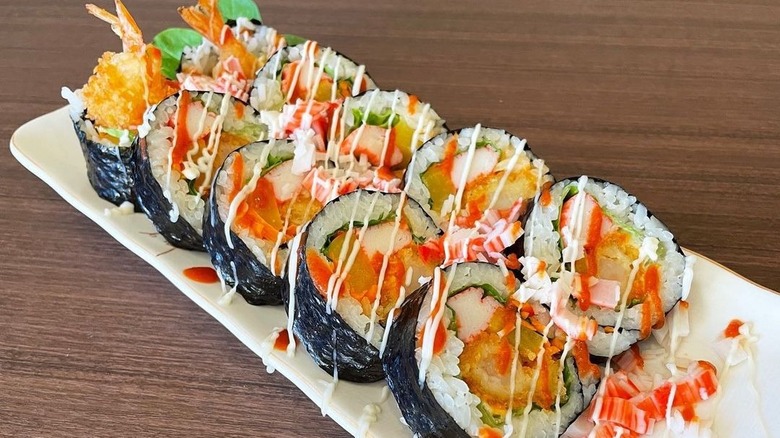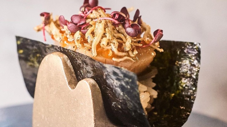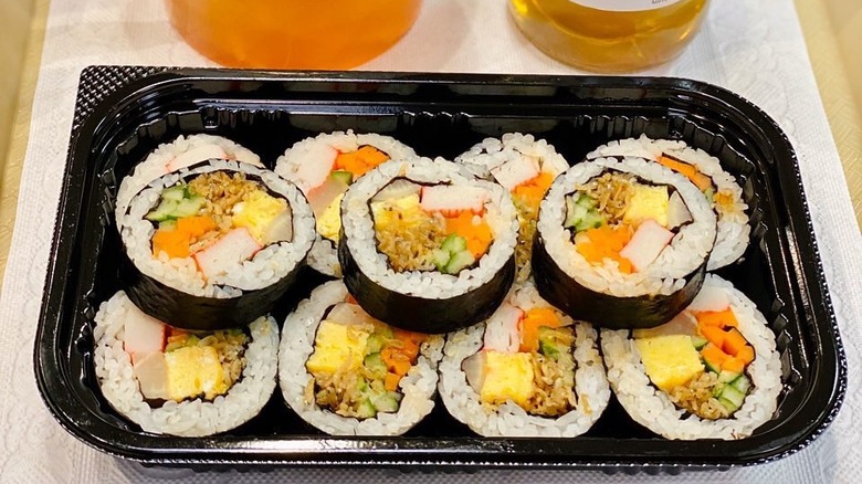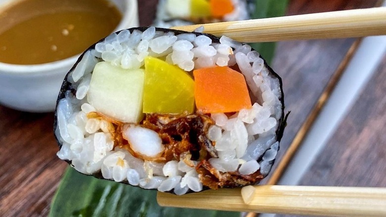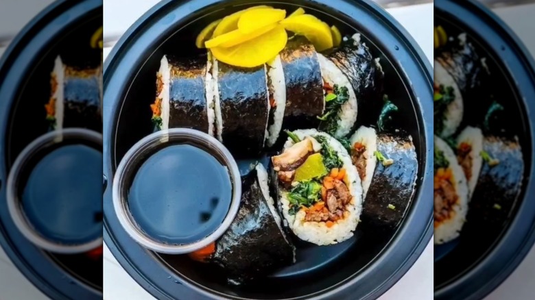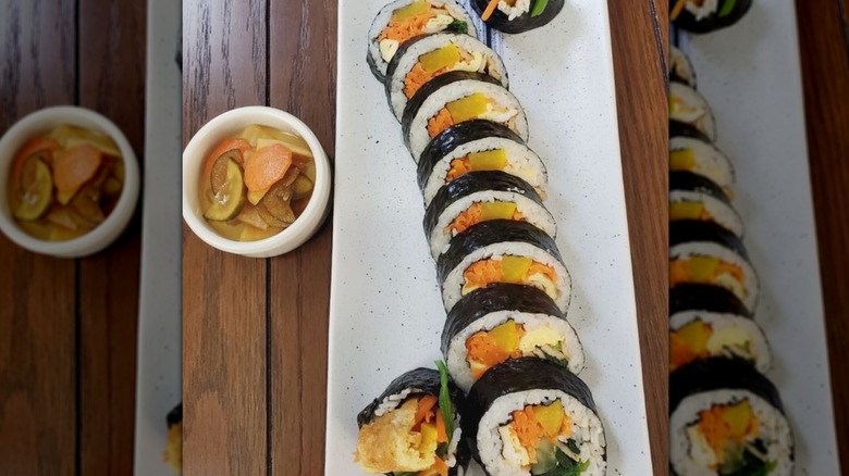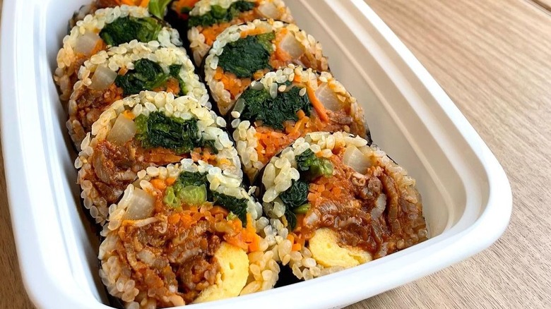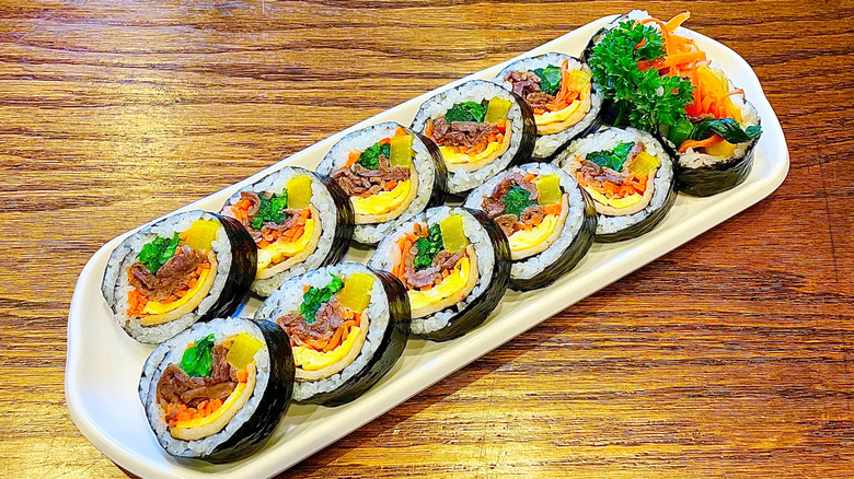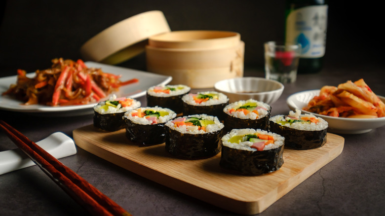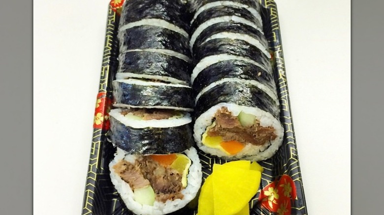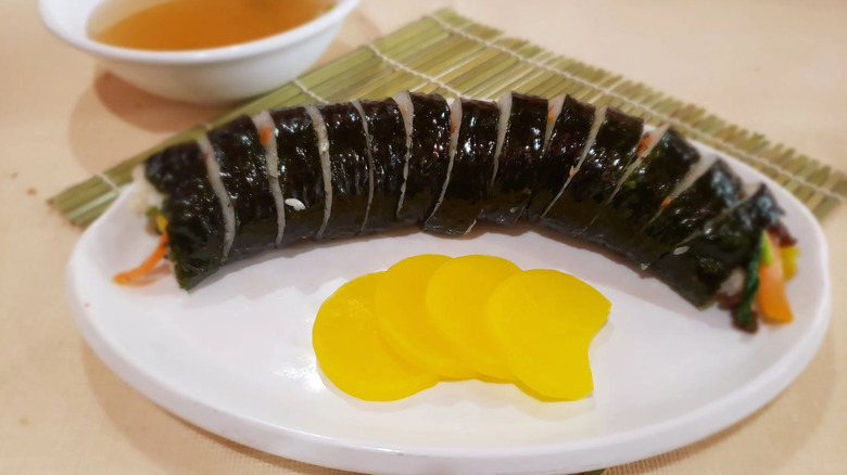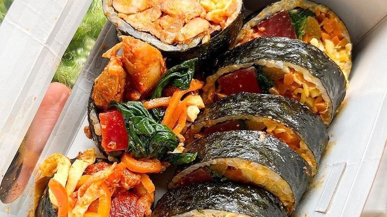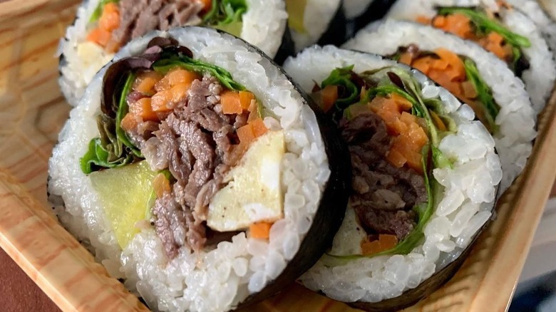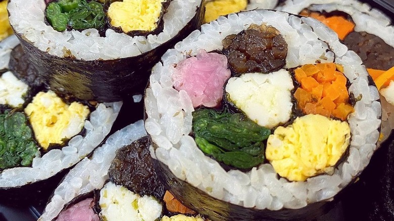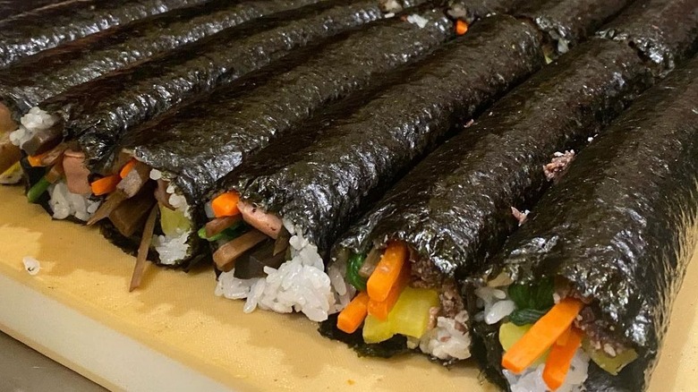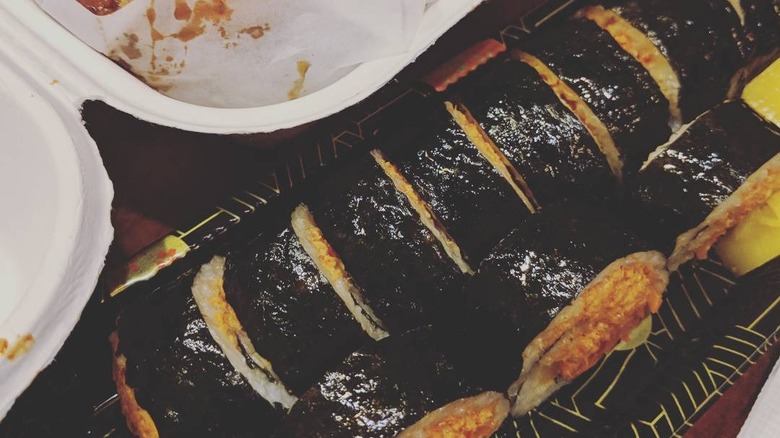 Kimbap, a Korean rice roll sandwiching a number of traditional ingredients between a tightly packed dried seaweed wrap, is a big favorite of ours. While similar in appearance to Japanese sushi, you shouldn't try to compare the two or make the wrong assumption they are just Korean and Japanese versions of essentially the same thing. Typically consisting of a few separately prepared ingredients — a variety of cooked poultry, meat, or fish, and both pickled and fresh vegetables — great kimbap typically never employs dips like soy sauce, although Korean chili pastes and spices like gochujang might show up inside the roll.