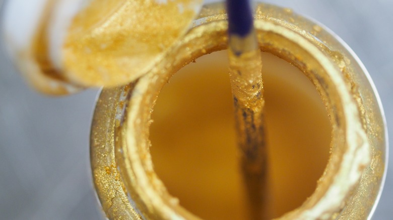 If you can't find edible paint at the store or have a specific color in mind for your cocktail designs, you can make your own edible paint at home fairly easily. For a boozy paint recipe, mix a quarter cup of vodka with equal amounts of corn syrup. Then, add in your food coloring of choice and adjust the hue according to the intensity and vibrancy you'd like your paint to have. Consider combining primary colors like red, blue, and yellow to build unique shades that can complement the flavors you'll be using in your cocktails or include edible sparkles or gold dust to create more of a luster for the paint. If you're preparing to serve alcohol-free drinks to guests, edible paint can be made with lemon juice instead of vodka, and you can decorate your glasses with swipes of boozeless color. When it comes to making edible paint, you have a world to explore, as edible paint can also be made from beetroot juice and pectin if you're looking for a darker-hued purple accent for your drinks.