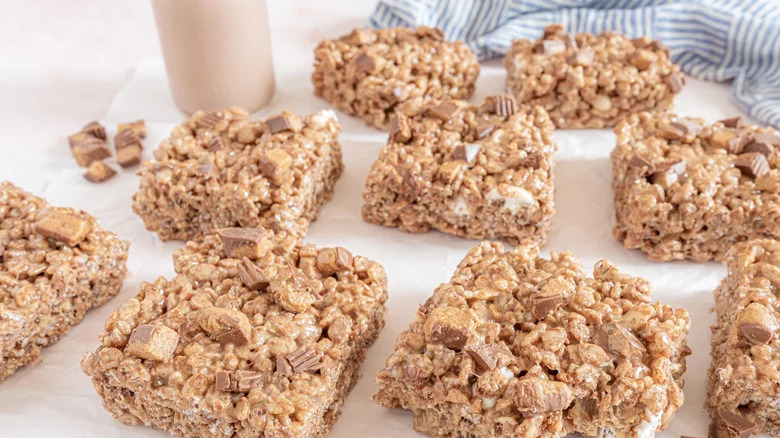 We love the fruity flavors of homemade Rice Crispy treats with Fruity Pebbles — and we especially love that we can make the recipe without really changing anything (besides the cereal) from the classic. You can, however, add a bit of texture by studding the bars of freeze-dried strawberries after they've been placed in the pan. Arguably, though, Cocoa Krispies are a much more versatile cereal to work with because you can include candy additions like chopped Butterfingers, peanut butter cups, and a chocolate drizzle. We also see the potential of adding a bit of cookie butter to the bars for a creamy, cinnamon undertone.