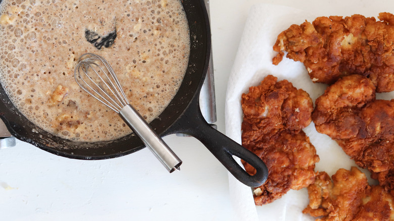 Pour the gravy over the fried chicken and serve