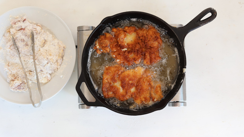 With your dredging station ready to go, add oil to a large, cast iron skillet. There should be at least an inch of oil in the pan — you want to make sure there's enough to almost fully cover the chicken when it's added. Use a thermometer to ensure the oil reaches 350 F before you start frying.