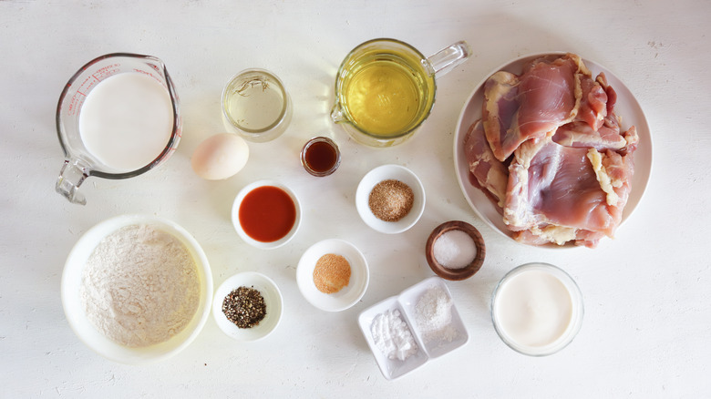 For the perfect chicken fried chicken and gravy, make sure you have the following ingredients on hand before you start cooking. You'll need chicken thighs, salt, pepper, flour, baking soda, baking powder, seasoned salt, garlic powder, milk, pickle brine, an egg, hot sauce, honey, and heavy cream. You'll also need oil for frying — generally vegetable oil or canola oil work best.