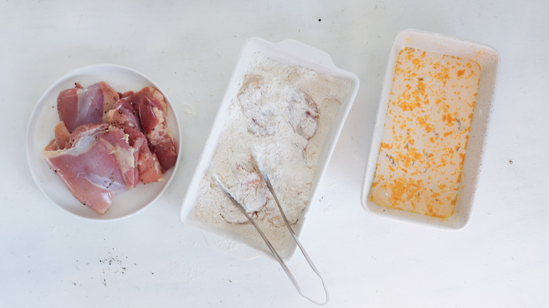 - Add the dredged thigh to the egg and milk mixture and coat both sides.