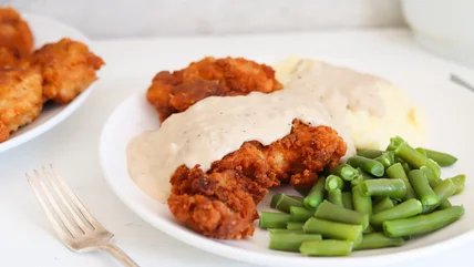 Your dinner is now ready to serve. Remove the chicken from the oven and plate it, pouring the gravy over the fried chicken. "I definitely recommend serving it with mashed potatoes, but a baked potato can work as well. Any kind of vegetable side like green beans is also delicious," recommends Maroney.