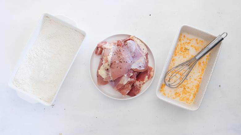 Before diving in, you want to prep your chicken and the dredging station so everything is mise en place when it's time to start frying the chicken.