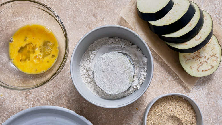 - Prepare a dredging station. Set up the flour in one bowl, the egg in the next bowl, and breadcrumbs in a third bowl. Dredge the eggplant first in the flour, then coat completely in egg, then press into the breadcrumbs to coat completely. Sprinkle with salt and pepper and set aside.
