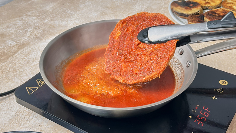 There are two ways you can do this, and neither way is wrong. First, you can pour the guajillo mixture into a saucepan and add the bread, soaking each side in warm sauce. You can also let the bread soak in guajillo sauce, then heat a skillet and fry the soaked bread until crispy and browned. The first method will result in a softer sandwich, while the second will yield a crispier bread.