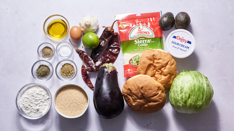 For the sandwich filling, you'll need a large eggplant, flour, egg, breadcrumbs, oil for frying, shredded lettuce, sour cream (or crema), cotija cheese, and ripe avocado. The most important ingredient, of course, is the bread, which you'll want to try and source a few days before cooking. For this, look for telera or bolillo rolls, which are both dense rolls that resemble giant hamburger buns. If you can't find these, use hamburger buns and make smaller pambazos.