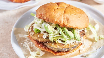 The many variations of pambazo sandwiches offer options for vegans and vegetarians, all while keeping the same guajillo-soaked bread and messy toppings. This recipe developed with Michelle McGlinn is a filling vegetarian alternative made with thick slices of fresh eggplant. Fried crispy, the eggplant makes the perfect addition to the spicy sandwich without losing any of its salsa-soaked charm.
