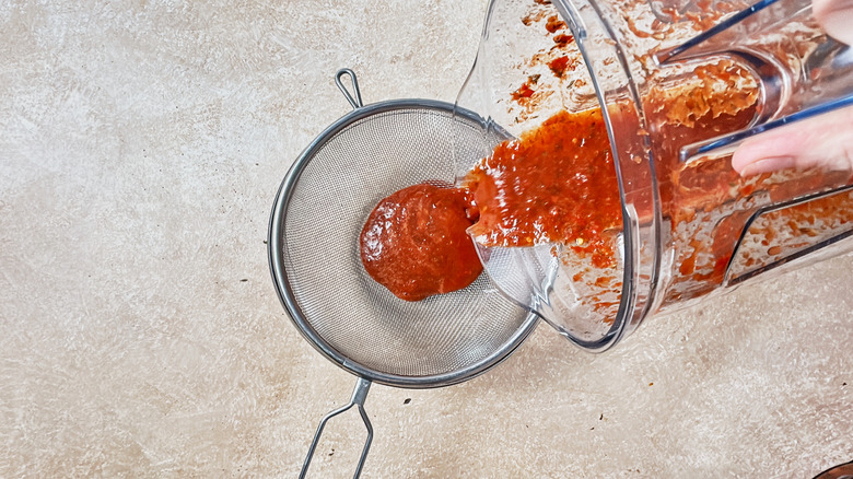 Because Guajillo peppers are sold dried, the chiles need to be rehydrated before using. The good news, though, is that the rehydrating liquid can be reused to flavor the sauce. Simmer the peppers in water until they are soft and bright red, then transfer to a blender with garlic, onion, and the spices. Add some of the rehydrating liquid, then blend until very smooth. Straining the sauce is up to you; if you have a great blender, your sauce may be smooth enough to use as-is. If you'd rather strain spare seeds out, simply run the sauce through a fine strainer.