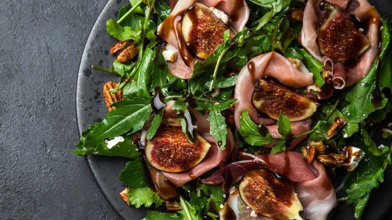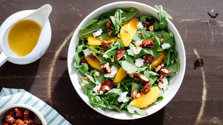 As part of its adaptability, an arugula salad can span a range from just a few ingredients to hosting a whole party of flavors. It's all about finding the right balance. Kept simple, you can make a delicious arugula side salad using a basic olive oil and lemon juice dressing with some shredded or grated Parmesan on top. In this scenario, it's the acid of the citrus and the saltiness of the cheese that counterbalance the arugula, allowing just enough flavor to cut through and be tasty but not overwhelming. Add some grilled-to-perfection steak to it — something that other greens, such as those found in a spring mix, could not withstand — and you've turned your side salad into a full meal.