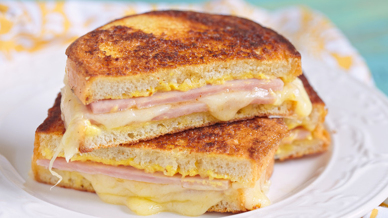 The process for making these sandwiches is similar to that of grilled cheese. First, you slather one slice of bread with mayo and the other with mustard. Then you arrange your meat and cheese between the slices and dip the whole sandwich in a mixture of eggs, milk, salt, and cinnamon or nutmeg. After you've melted a little butter in a skillet, fry the sandwich for a few minutes on each side until it's golden brown, just like you would with a grilled cheese. Typically, the sandwiches are then topped with powdered sugar and served with a side of jam or honey.
