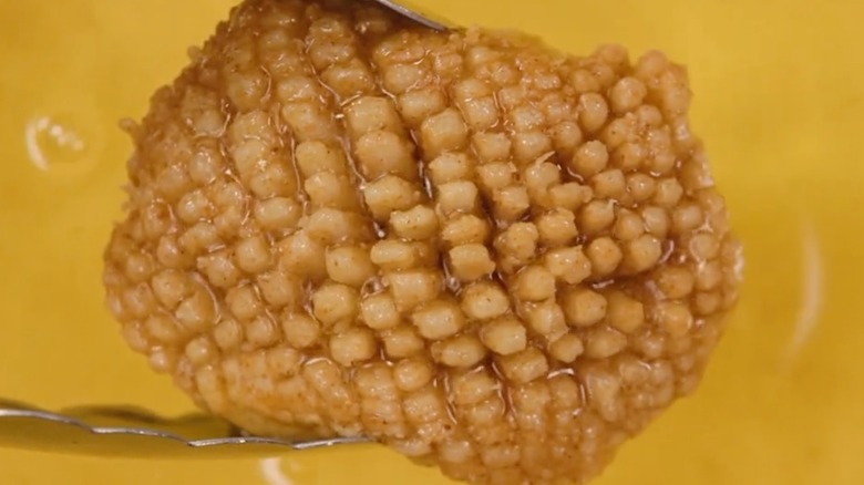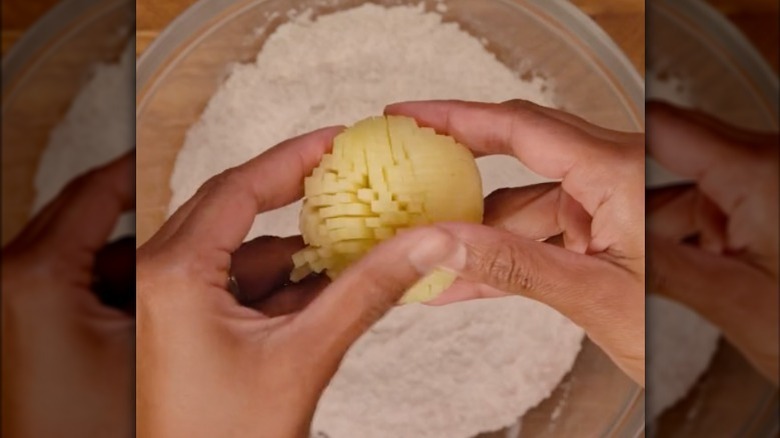 If you're short on time and have this appliance at home, potato pom poms can also be made in an air fryer. The technique is much the same with the potatoes being cut through before being given the seasoned flour treatment. Set the air fryer to around 350 degrees Fahrenheit and for about 15 to 18 minutes. While the result will likely lack some of the wow factor of deep-fried potato pom poms, the crunch will definitely still satisfy.