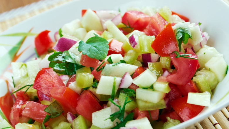 Whether in a caprese salad or pico de gallo, chopped tomatoes deliver a refreshing hit. Although the fruit is believed to have originated in South America, it's no surprise that it's now enjoyed on every continent. With their balanced, slightly tangy flavor, tomatoes fit well into many dishes, including one particular staple out of Eastern Africa: The commonly enjoyed tomato salad known as kachumbari.