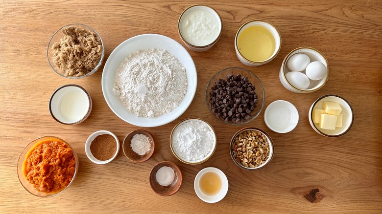 Gather your ingredients for chocolate chip and pumpkin streusel muffins