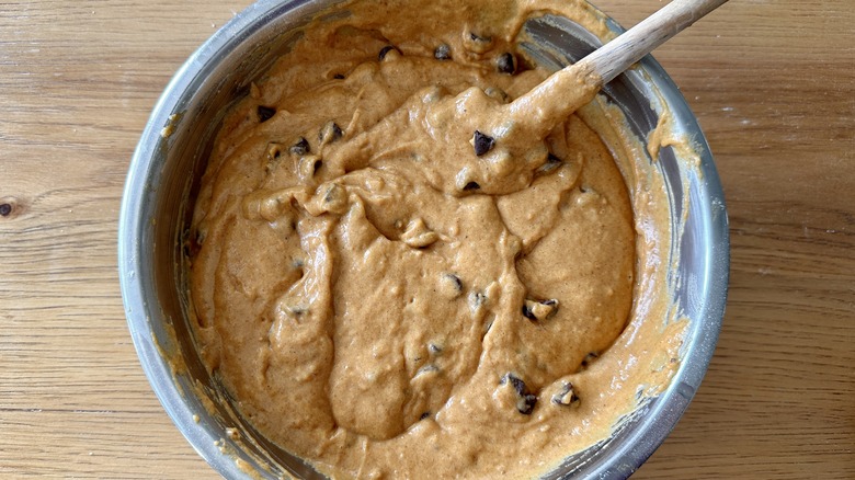 - Add the pumpkin, eggs, buttermilk, and oil to the bowl, and stir until the batter is smooth. Stir chocolate chips into the batter.