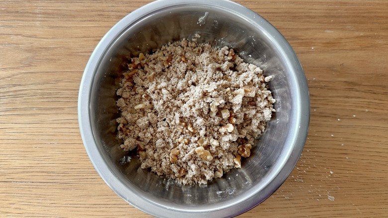 - In a small bowl, combine ¾ cup flour, ⅔ cup brown sugar, ½ teaspoon pumpkin pie spice, ½ teaspoon salt, and butter, then mix everything with your fingertips until uniform. Toss in walnuts; set aside.