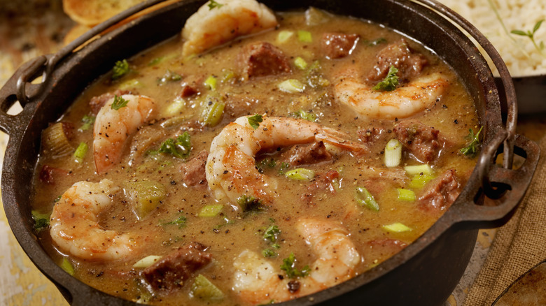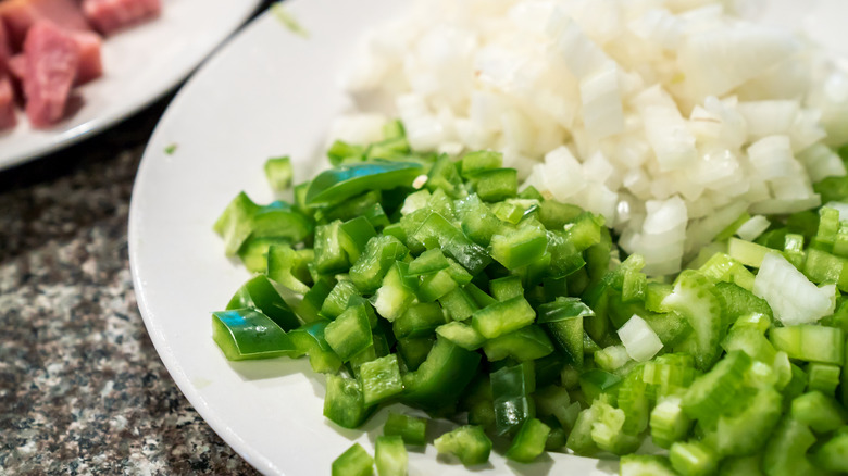 Mirepoix is the French culinary term for a combination of diced onions, carrots, and celery, which are used as the base of many familiar soups and stews. These simple vegetables combine to create complex flavors that are important for taste and balance in whatever finished dish they are part of. Many cultures have their own version of mirepoix. For example, Spanish sofrito adds tomato and garlic to the mix. In Italy, you'll find a variation called soffritto, which takes a mirepoix base and adds olive oil and sometimes garlic and wine. For all of the varieties around the world, there's one place that pioneered the inclusion of bell peppers in mirepoix: Louisiana.