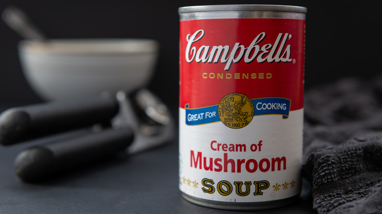 It's an easy fix to give a basic dinner more creaminess and umami-rich flavor, especially in dishes that call for a mushroom sauce. Making a mushroom sauce from scratch can take a bit of time because you have to make a roux, add dairy, and let it thicken — and that doesn't include the time it takes to brush the mushrooms clean and cook them down separately. That's where the canned mushroom soup comes into play, so let's get into how you can make it your own and use it as an easy (and delicious) sauce swap.