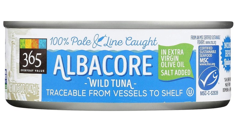 A lot of folks these days are concerned about where their tuna comes from, as well as what's in it. The 365 by Whole Foods brand ticks all the boxes for sustainability, as it is completely pole and line caught. Whole Foods takes pride in the fact that their tuna has a completely transparent journey from the fishing boat to the shelf. Like all of Whole Foods' products, it doesn't have any weird additives or preservatives. It's simply tuna, olive oil, and sea salt.