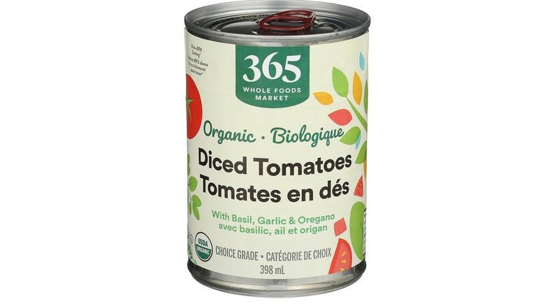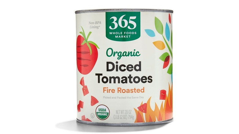 There's nothing that beats fresh, but when it comes to canned, you can't do better than tomatoes that were picked and then canned on the very same day. Whole Foods diced tomatoes are able to make that claim, and they're also free of unwanted sweeteners and flavorings. The fire-roasted version of their diced tomatoes gets its flavor from the pleasantly charred taste of being cooked over a fire. The contrast of natural sweetness and smokiness makes them a more interesting ingredient choice than plain diced tomatoes.