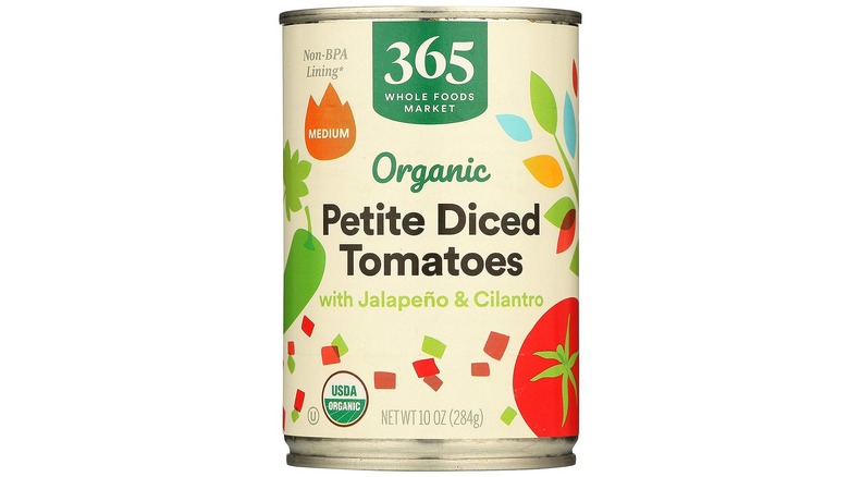 Italian spices don't work with every type of dish so luckily for Whole Foods shoppers, the 365 brand also includes a variety of canned diced tomatoes with a decidedly Tex-Mex flavor profile. The Petite Diced Tomatoes with Jalapeno & Cilantro are flavored with organic jalapeño chiles and cilantro for maximum flavor. They have more than a hint of real heat, making them just right when you're making a spicy dish.