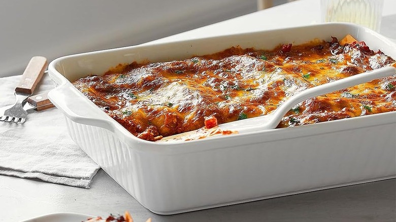 A casserole dish is a cooking and entertainment staple that every home cook should have in their kitchen. This 9-inch by 13-inch rectangular pan can be used for a litany of savory and sweet recipes, including casseroles, classic lasagna, brownies, and roasted vegetables. Like other cookware products, the price of these dishes can range from a mere $10 to upwards of $300 and come in materials including glass, ceramic, and porcelain. But what is the difference between these casserole dishes, and will it genuinely make a difference for your Sunday night lasagna if you opt for the thriftiest one?