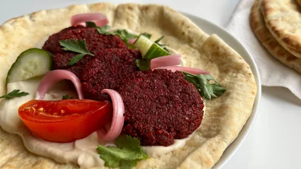 This fresh take on falafel includes roasted beets, creating a taste that has a slightly sweet flavor and a color that really sets this version apart.