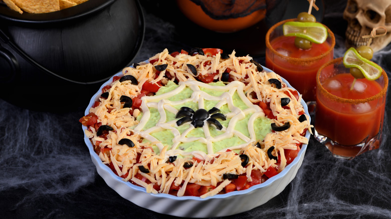 Hosting a Halloween party is all about setting the scene. There are endless ways to drive home the spooky theme, from the decorations to the menu. Yet, while you could offer guests ghoulishly-inspired fare like mummified pigs in blankets, deviled egg eyeballs, or jack-o'lantern-inspired stuffed peppers, crafting these recipes can take some time and effort. In this case, there are easier ways to create chillingly eerie offerings. For the ultimate Halloween hack, stick to serving your go-to party dip — just reevaluate your choice of tableware.