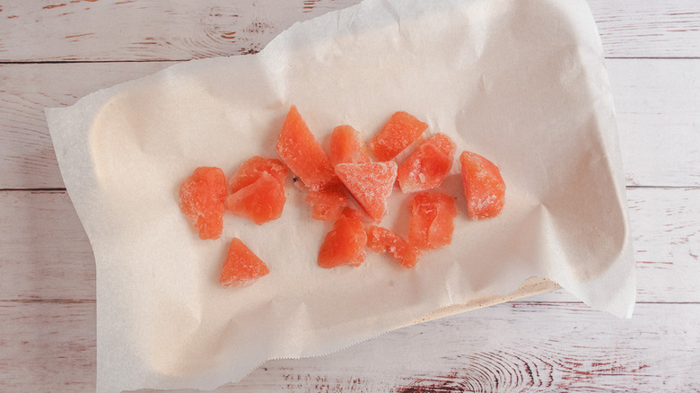 - Prep a day ahead by arranging the watermelon chunks on a baking sheet covered with parchment paper, avoiding overlap. Freeze them overnight.