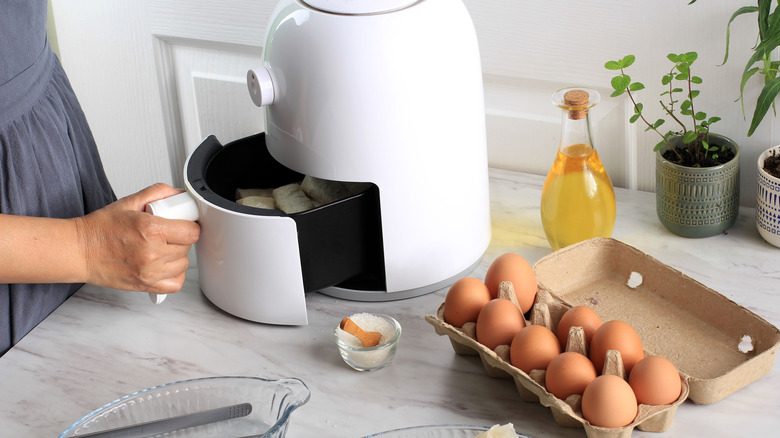 Perfectly peeling a shell from an egg can be a tricky pursuit. If you aren't careful, you can easily remove a chunk of hard-boiled egg, ruining its geometric flawlessness. Inside is a membrane that's responsible for keeping the albumen, or egg white, attached to the interior lining. The fresher the egg, the stronger the bond between the membrane and egg white. Tearing the egg whites is far from uncommon though, there are many hacks that were invented specifically to avoid that. One of the lesser-known ways to make hard-boiled eggs that peel easier is by using an air fryer.