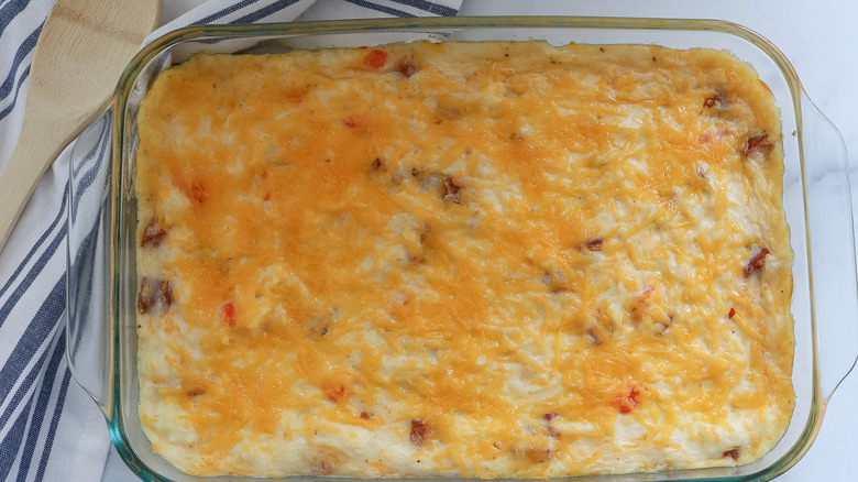 Pour the potato mixture into the greased baking dish. Finish it off by sprinkling the rest of the cheddar cheese over top. If you're meal prepping, Morone notes, "You can definitely assemble it before baking it and freeze it until you are ready to use it." In this case, she says, "the baking time would be increased to about an hour, and you will want to cover the top with foil until about 15 minutes before it's done baking so the top doesn't burn."