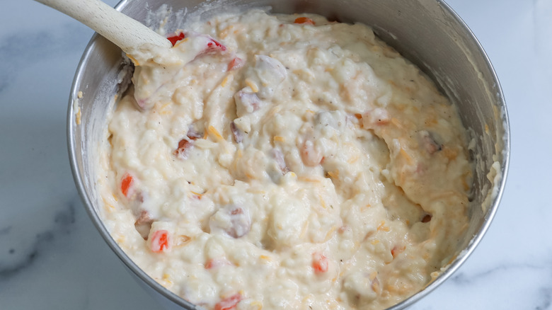 If they aren't already in one, transfer the cooked potatoes to a large bowl and mash or beat them with an electric mixer until they are smooth. Stir in the remaining butter, sour cream, mayonnaise, milk, Cajun spice, salt, and pepper, and mix until the contents are well combined. Finally, fold in the sausage and vegetable mixture as well as 1 ½ cups of cheddar cheese.