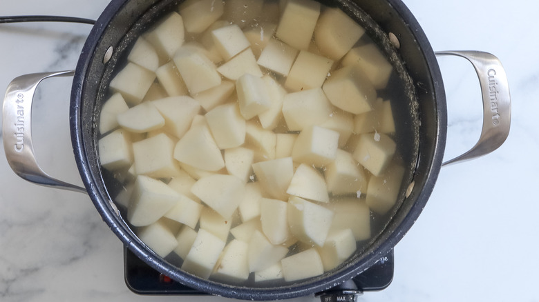 - Put the potato cubes in a large saucepan with enough water to cover them. Bring the contents to a boil and cook the potatoes for about 15 minutes until they are tender.
