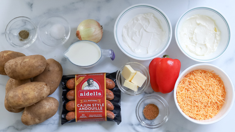 For this recipe, start by dicing large russet potatoes into 1-inch cubes. Next, you'll need unsalted butter, andouille sausage, a medium onion, and a medium red bell pepper. Chop the sausage, onion, and bell pepper before you start cooking. For the creamy consistency, pick up sour cream, mayonnaise, and milk, and season the dish with Cajun spice, salt, and freshly ground black pepper. Finally, make sure to shred plenty of cheddar cheese.