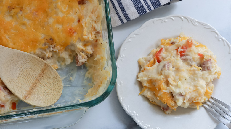 "I love potatoes," says recipe developer Jessica Morone, "They always make the best side dishes." If you feel a certain kinship with Morone following her revelation, then you'll feel it even more once you make her latest potato-based recipe. As she describes, "This Cajun potato casserole recipe is a fun dish filled with spicy and smoky Cajun flavor." With a rich and creamy filling complete with potatoes, sausages, peppers, and cheese, this nourishing meal can be included in a range of spreads.