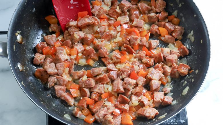 - Add the sausage, onion, and bell pepper, and cook for about 10 minutes until the onion is tender.