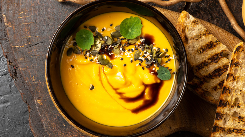 There's nothing to stop you from serving Styrian pumpkin seed oil with a slice of good bread, but there are also a myriad of savory ways to use the green gold. For instance, a dash of pumpkin seed oil is the perfect final touch when added to soups, pizzas, grilled vegetables, roasted meat, poached fish, pasta sauces, and even a butternut squash risotto. It can also be whisked into vinaigrettes or swirled into savory spreads like pesto for an added burst of flavor. Plus, you can also add it to recipes where oil isn't subject to heat for an extended period of time, like scrambled eggs.