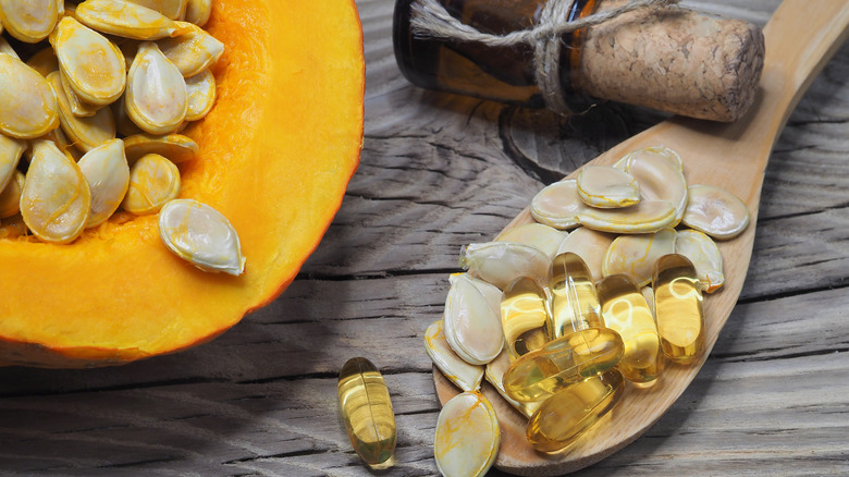 According to Healthline, pumpkin seed oil is loaded with omega-6 fatty acids, can support heart health, as well as help maintain optimal blood sugar levels. It also promotes urinary tract health, particularly when it comes to prostate and bladder function. Plus, pumpkin seed oil is teeming with antioxidants like polyphenols and carotenoids, which work to reduce inflammation in the body, as well as combat chronic illness. It's even been known to increase hair growth when applied topically.