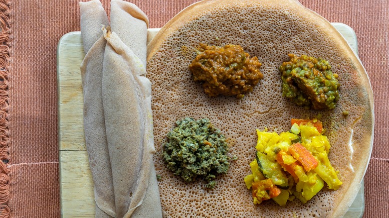 Like most Ethiopian dishes, beyaynetu is served with the teff flour bread known as injera. Injera has a soft, spongelike consistency that's perfect for soaking up the thick stews that are equally as cognizant in Ethiopian cuisine. In the case of beyaynetu, injera doubles as the plate and the cutlery. It is often served underneath said stews and on the side and is scooped by hand, bite by bite, into the stews. As mentioned above, beyaynetu is a combination of vegetarian dishes, and Ethiopian restaurants will often offer different sizes, from three to four to six different options.