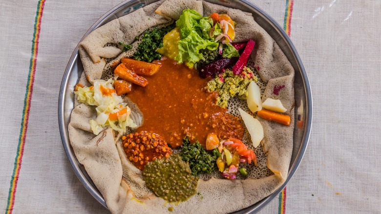 While that may sound like a lot, as the Orthodox Church defines it in this scenario, fasting doesn't mean to refrain from eating all food — just meat, eggs, and dairy. For this reason, you can find vegan and vegetarian dishes in abundance all across Ethiopia. Whether it be at a vendor on the street or a sit-down restaurant, there will be one, if not many, vegetarian and vegan options on the menu. From shiro be kibbe to miser wot, you'll have your pick. But, if you want a taste of all the plant-based foods that Ethiopian cuisine has to offer, beyaynetu is one of the most popular and most favored. It's sure to be your go-to.