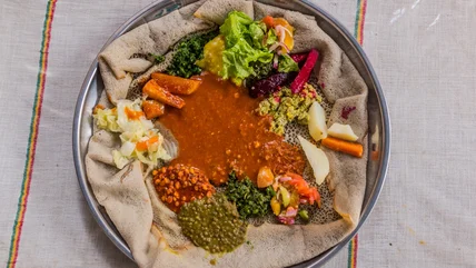 With access to exotic spices from India, Portugal, and East Asia, Ethiopian cuisine is a culinary illustration of the entire East African spice trade. Since the trade's existence, Ethiopian people have used such spices by combining them with their own indigenous grains — creating a cuisine that is distinctly and indisputably their own. Earthy, tart, pungent, sour, and spicy flavors are all present in stews known as wats that are often paired with a teff flour bread known as injera.
