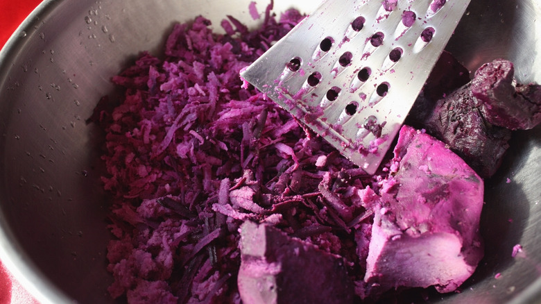 But anyone who's familiar with both will know that despite the striking similarities, ube and purple sweet potato aren't perfectly interchangeable. For one, ube has a notably subtler sweetness with stronger hints of vanilla and taro-like nuttiness. For another, purple sweet potatoes have a drier texture that results in a fluffy mash, not unlike regular potatoes; meanwhile, ube is more moist and firm and can have a mealy texture depending on how you cook and prepare it. The traditional way of breaking down cooked ube is actually grating it like cheese instead of mashing like potatoes, possibly to cut up the stubborn fibery strands present inside the flesh. However, cooked ube is more than soft enough to mash the same way you would a sweet potato if you don't mind the strands and prefer the chunkier texture.