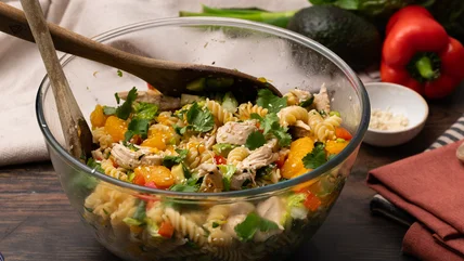- Slice or shred the chicken, and then place it into a large mixing bowl along with the pasta, mandarin segments, red pepper, lettuce, avocado, scallions, sesame seeds, and cilantro. Add the mixed pasta salad sauce and carefully toss everything together to coat, before serving.