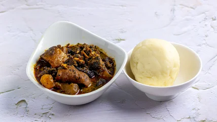 Hailing from the southern region of Nigeria, banga soup is a rich soup made from meat or fish, palm nut fruit concentrate, and an assortment of spices and aromatics, such as Cameroon, habanero, and scotch bonnet peppers. Banga also contains oburunbebe sticks, sometimes called African licorice sticks. Like other soups from Nigeria, it's eaten with "swallow," a type of side dish that is dipped into your soup of choice and swallowed, not chewed. Banga can be eaten with eba, a swallow made from fried cassava, or pounded yam, which is made from peeled, boiled yams. The ethnic groups that created banga eat it with delta starch, which also comes from cassava.