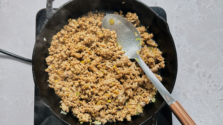 - Add the pork and cook until browned, crumbling until cooked through, about 5 minutes. Add the prepared soy sauce mixture and stir. Bring to a simmer and cook until reduced completely.