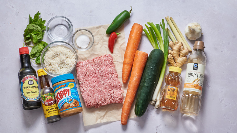 The pork is cooked stir-fry style, so you'll need fresh ginger, garlic, and scallions first. For the sauce that seasons the pork, you'll need lemongrass, soy sauce, sesame oil, and granulated sugar. For the pork itself, you'll just need a pound of ground pork. If pork isn't your thing, feel free to swap for beef or chicken.