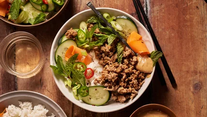 If you're making these for meal prep, store the rice and pork together, then prep the vegetables in a separate container for easy reheating and assembly. Want to make a feast out of it? These Thai pork bowls go well with fresh spring rolls and crispy, fried fish cakes.